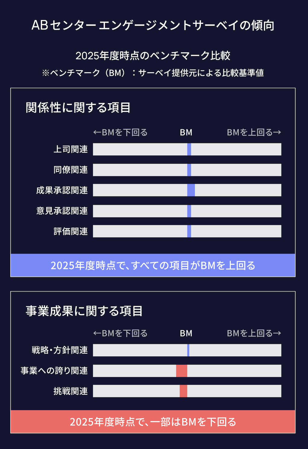 一方で、課題も見えてきました。関係性指標はベンチマークを上回っていますが、「やりがい」「挑戦する風土」といった事業成果に直結する指標はベンチマークを下回っています。