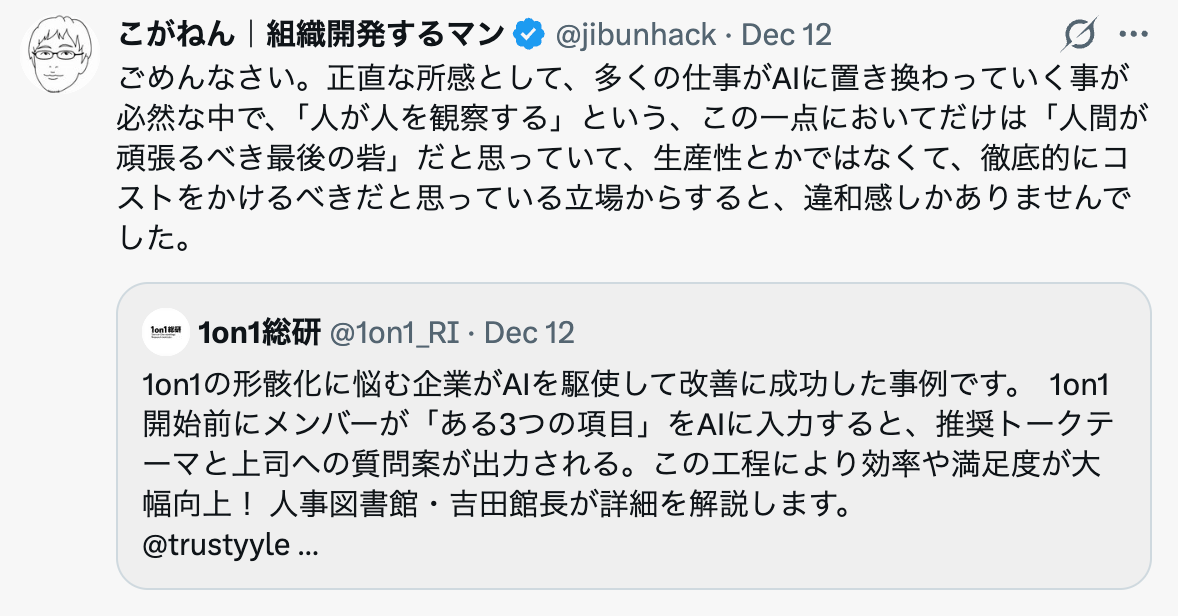 2025年12月12日、1on1総研で配信した記事がX上で大きな反響を呼びました。筆者は人事図書館館長の吉田洋介さん。AIを活用して1on1の事前準備を効率化し、対話の質と満足度を高めた企業事例を紹介する記事です。