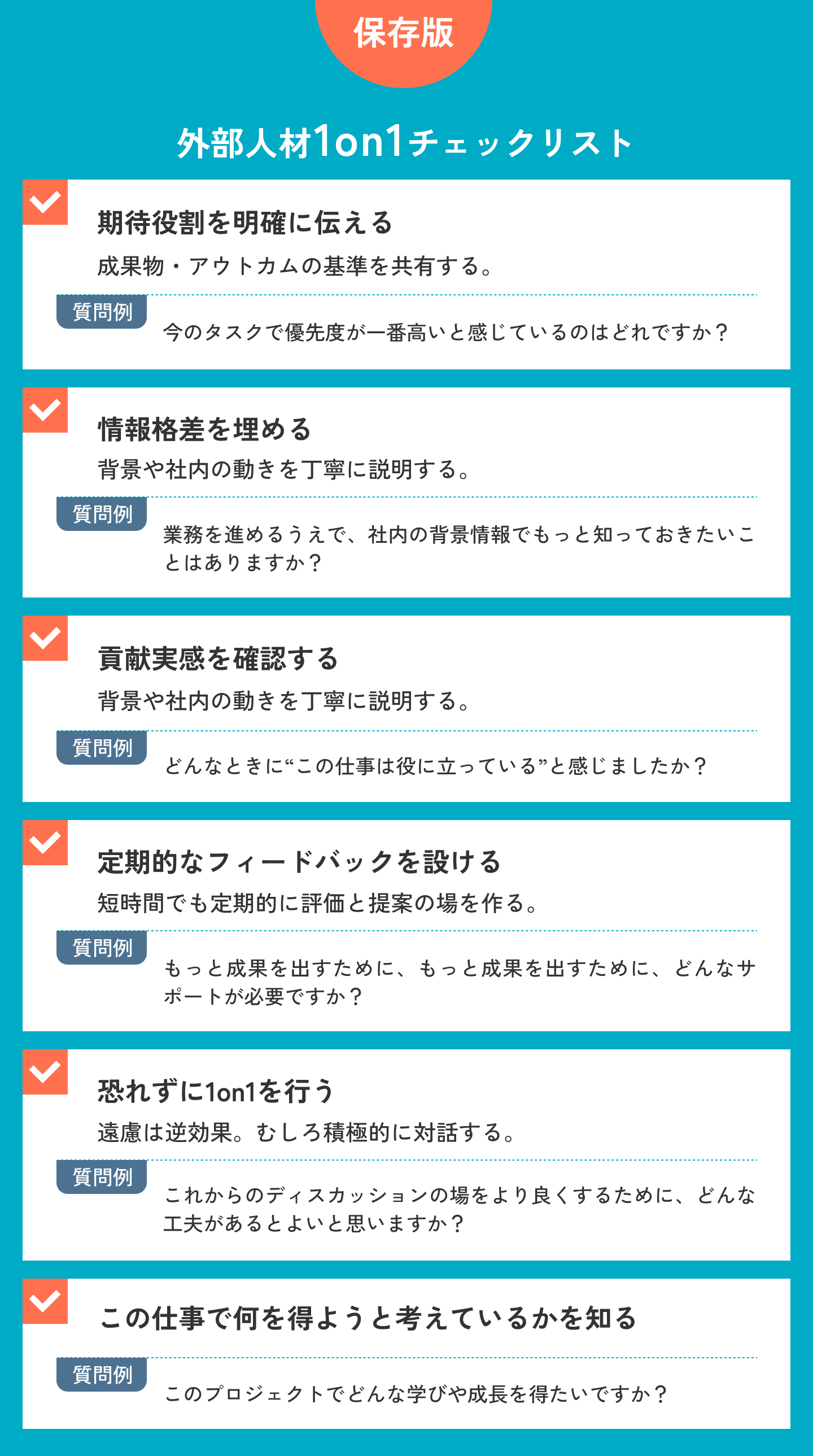 外部人材との1on1ではどんな点に気を付けるべきか。以下のチェックリストを参考にしてほしい。