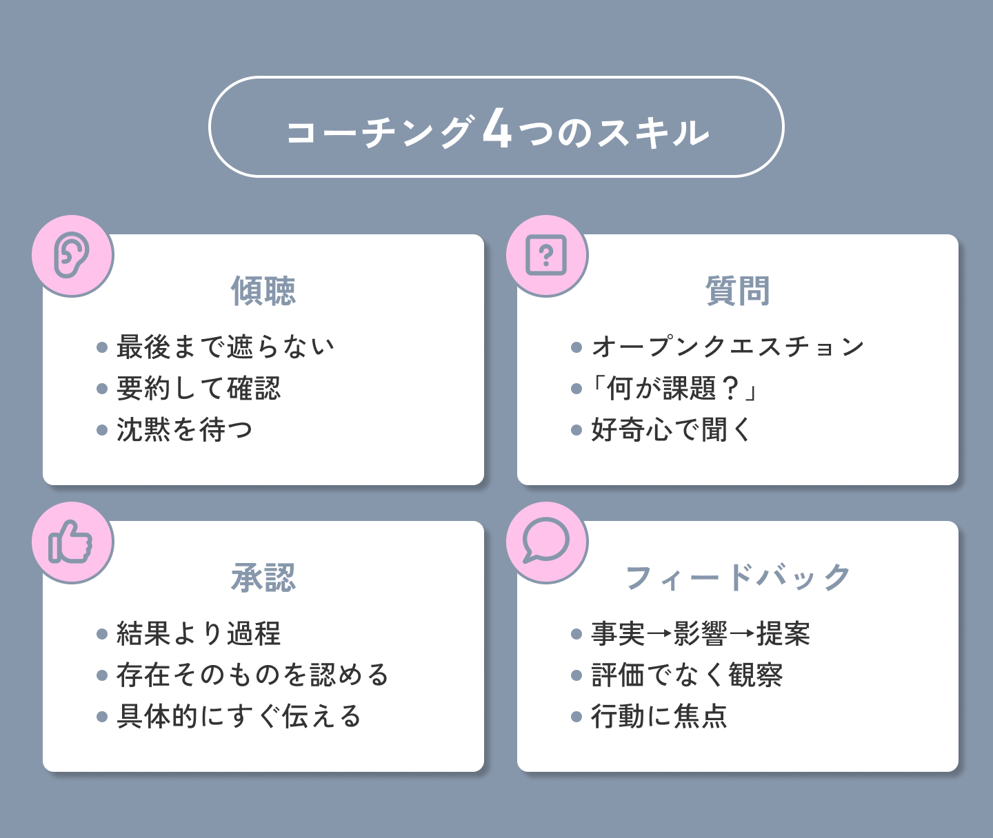 助言が早すぎたり、承認の中に評価を混ぜてしまうのはNG。三大スキルとフィードバックを意識するだけで、明日からでもコーチング的な関わりが始められます。