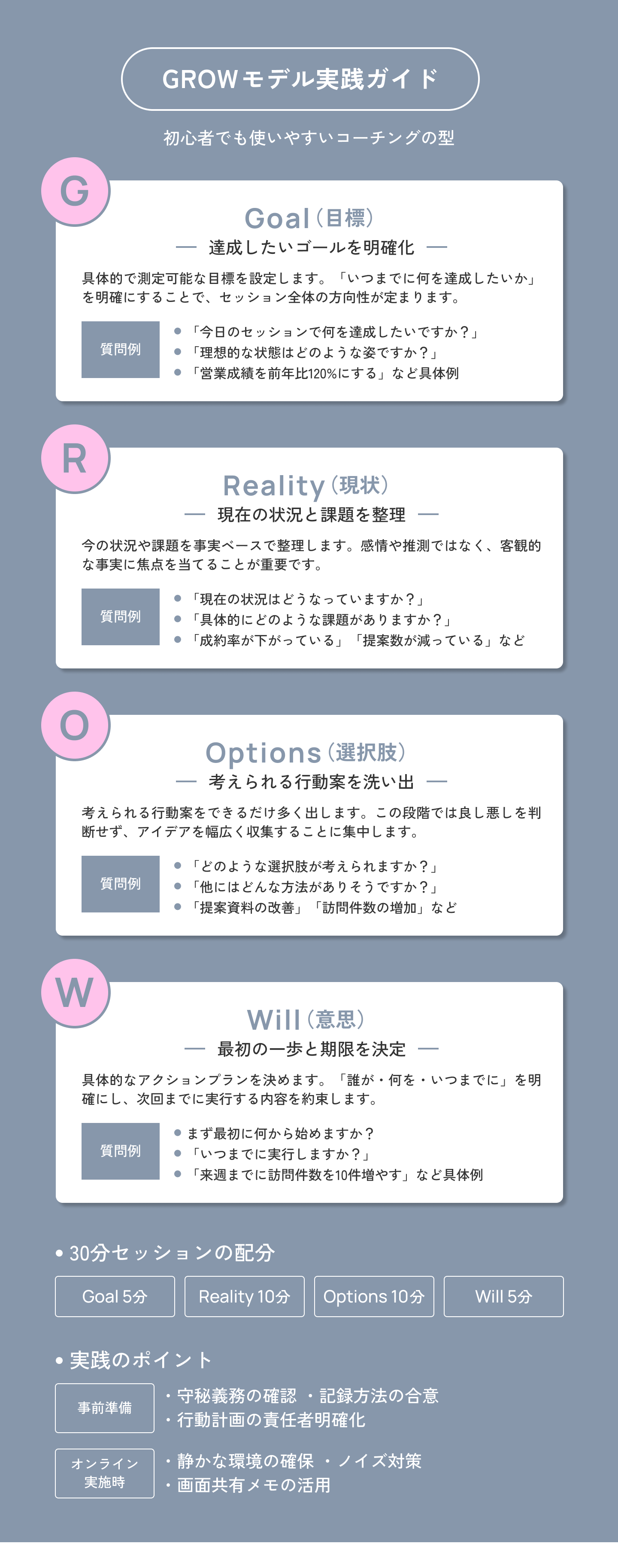 GROWモデルなら初めてでも会話の流れがつかみやすく、迷わず進められます。