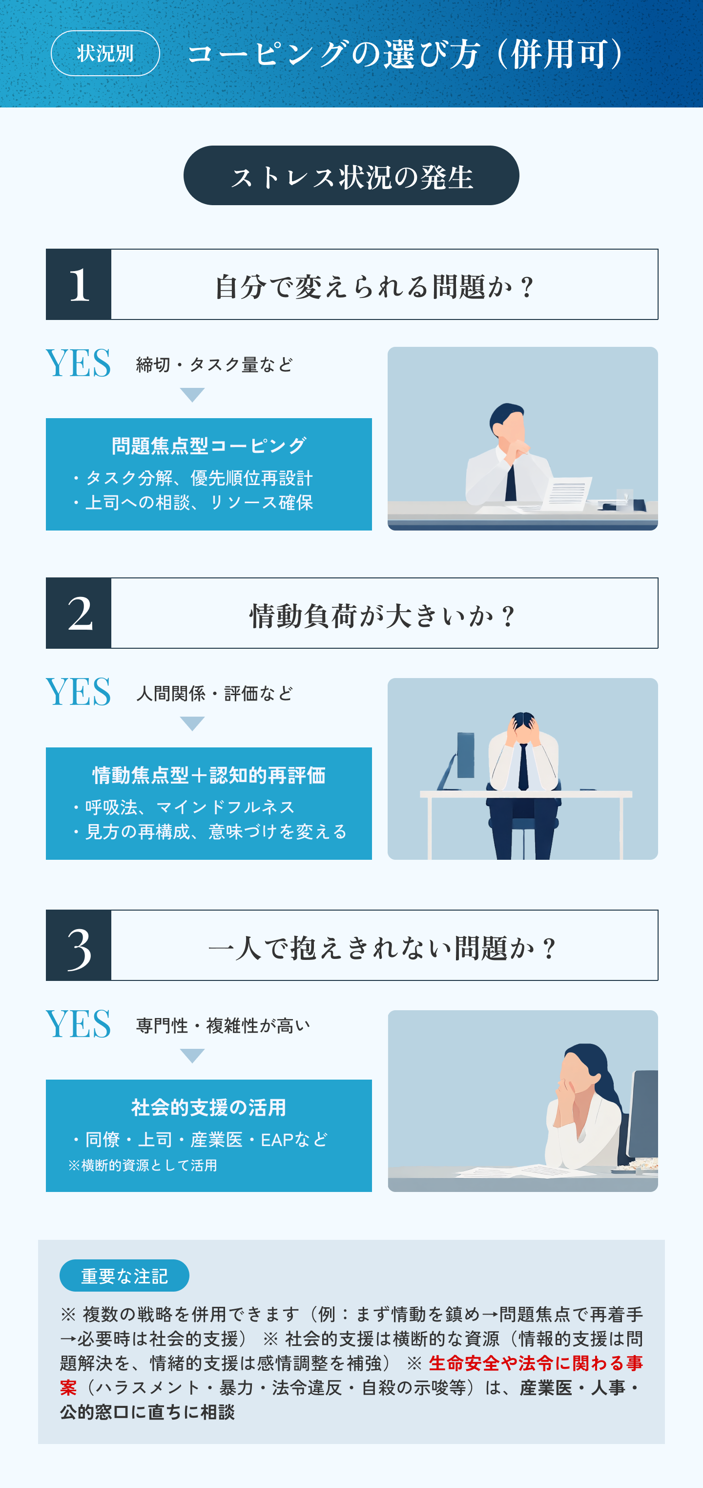 セルフモニタリングによって自分の状態を把握したら、次のステップは「その場でどう対応するか」です。これを「ストレスコーピング」と呼びます。難しく聞こえますが、要は「ストレスに直面したときの具体的な対処行動」を意味します。
