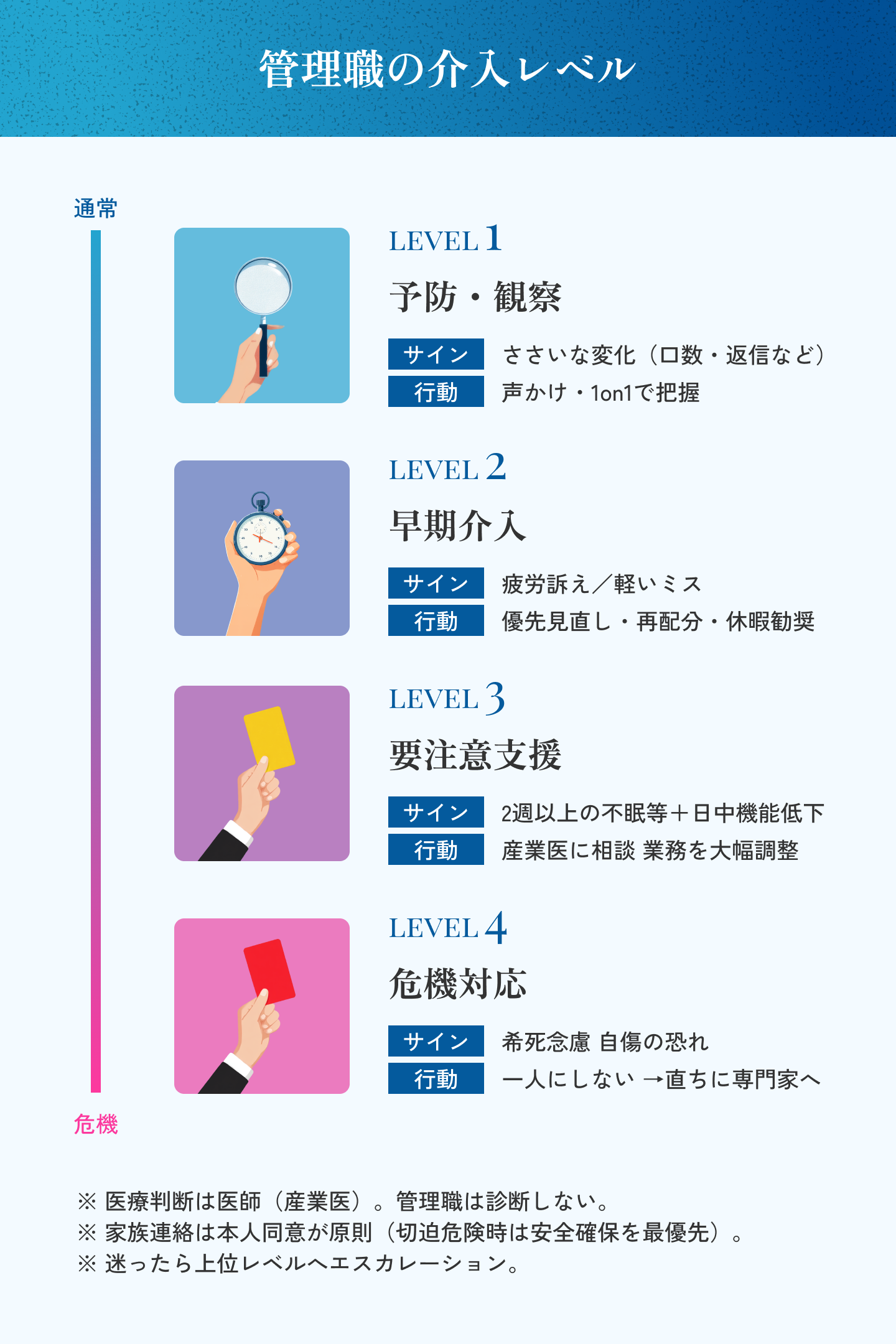 自殺関連の発言・示唆、著しい不眠や食行動の変化、実務に支障する抑うつや不安が強い場合は、ためらわず早期につなぐことが原則です(産業医・事業場内産業保健スタッフ/地域の相談機関・医療。)