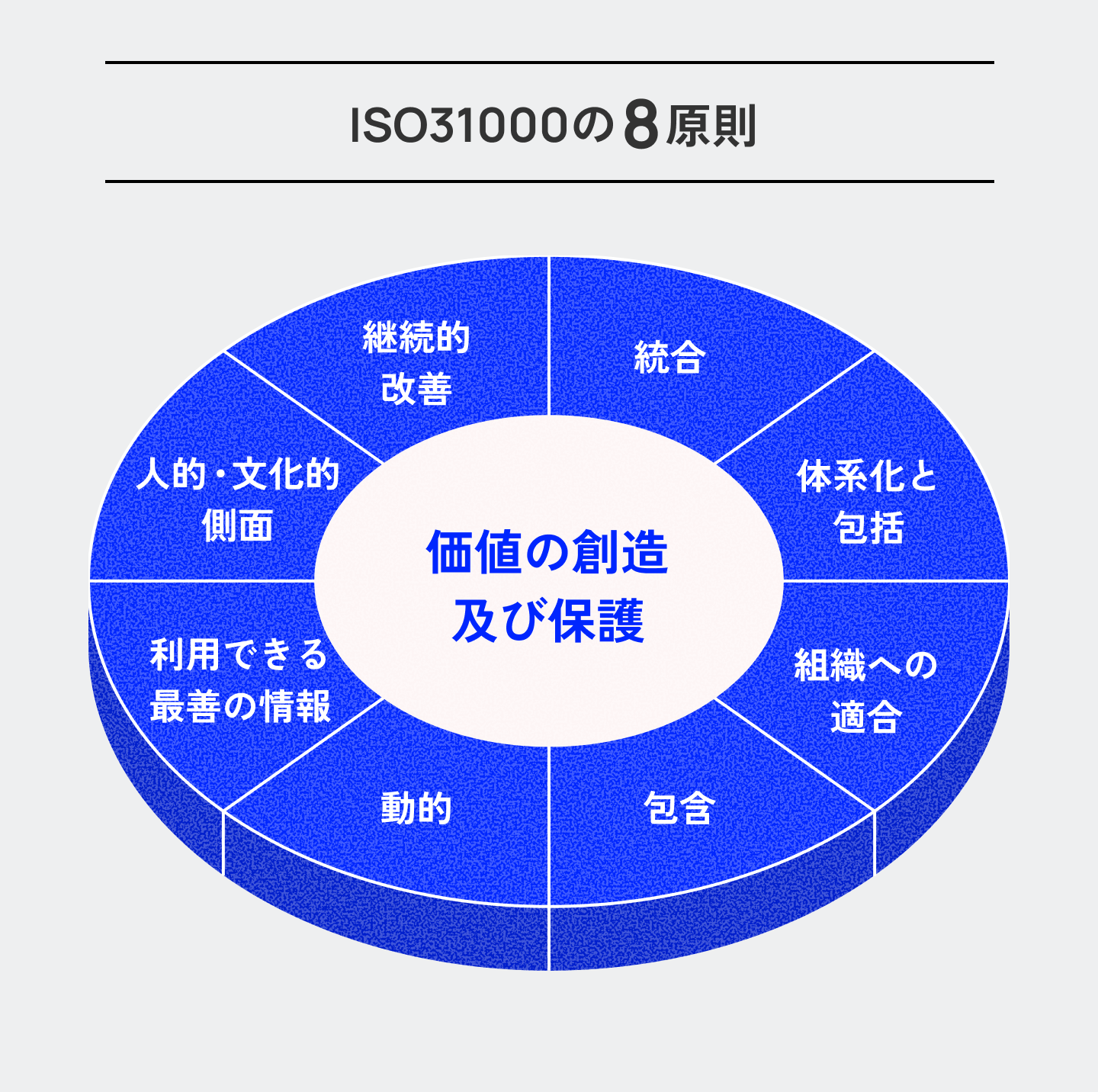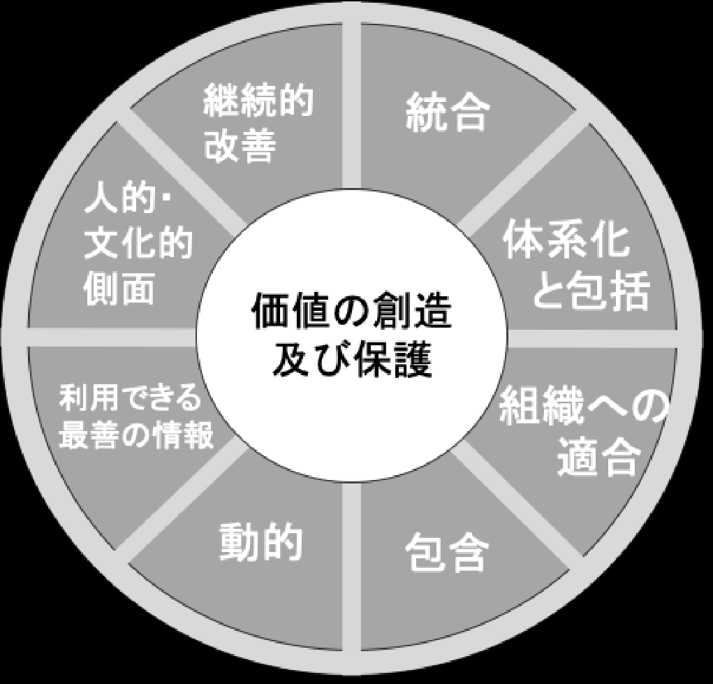 リスクマネジメントを効果的に行うための原則は八つあり、リスクマネジメントの意義である「価値の創造と保護」を中央に置く、以下の図で表されています。