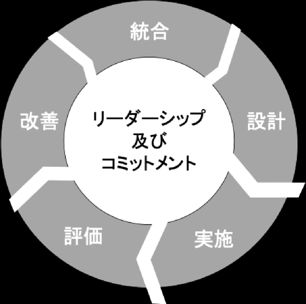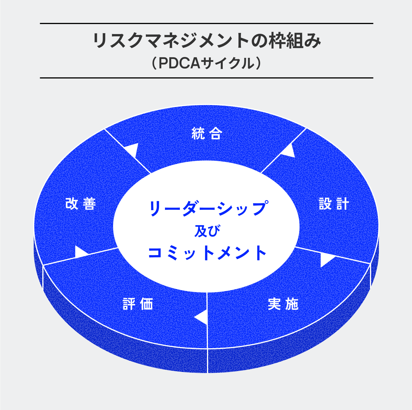 リスクマネジメントを実施する際は、経営者のリーダーシップとコミットメントが必須です。経営者のリーダーシップを中核とし、統合とPDCAの各要素によってリスクマネジメントの枠組みが構成されます。各構成要素について順に解説します。