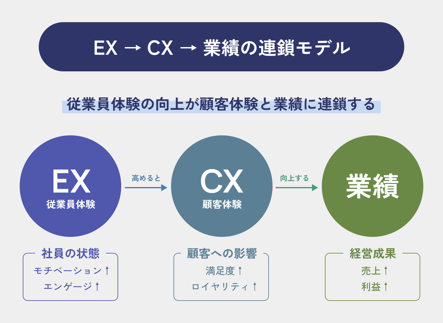 一般的には、従業員の体験(EX)が豊かであるほど、顧客体験(CX)も向上します。この関係は、「EX→CX→業績」という連鎖として語られます。