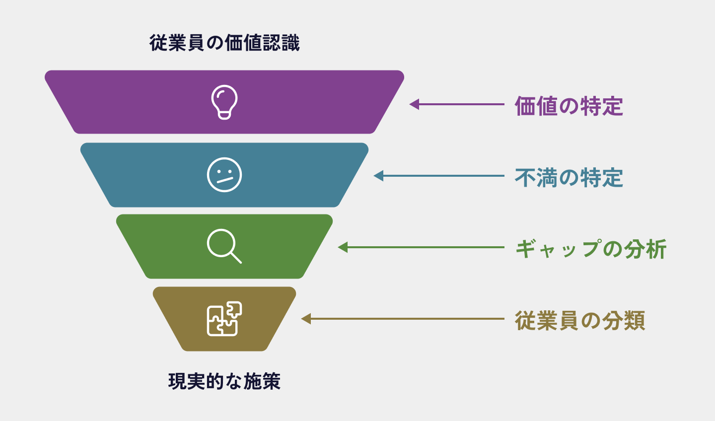 EXデザインの第一歩は、自社の従業員が何に価値を感じ、どんな点に不満を持っているのかを把握することです。その手法の一つがEVP(EmployeeValueProposition)分析。