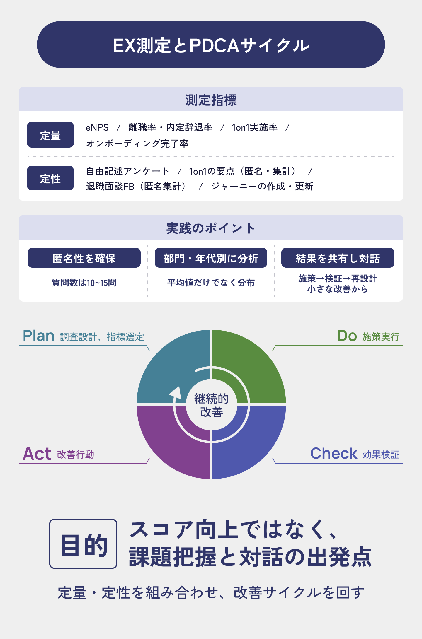 EXを本格的に向上させるためには、「感覚的な良し悪し」ではなく、現状を数値と声の両面から把握することが欠かせません。社員の体験を定期的に測定し、改善サイクルを回すことで、組織全体の動きを持続的に変えていくことができます。