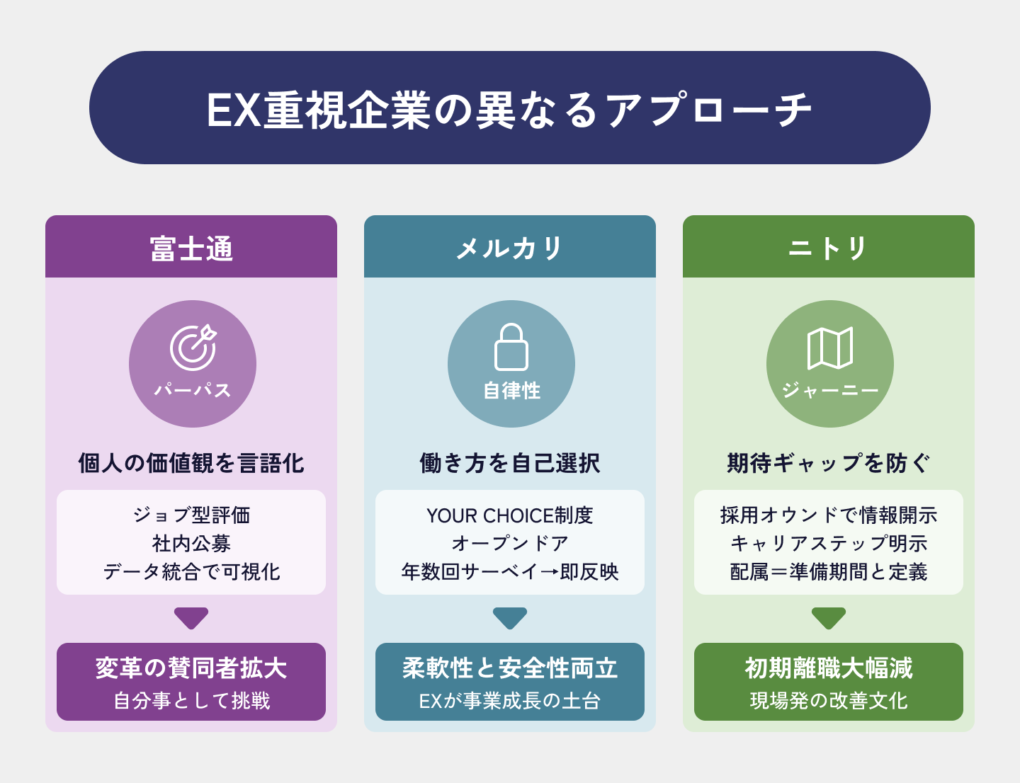 EX(従業員体験)を経営戦略の一部として位置づける企業は、日本でも着実に増えています。ここでは代表的な3社の取り組みを紹介します。