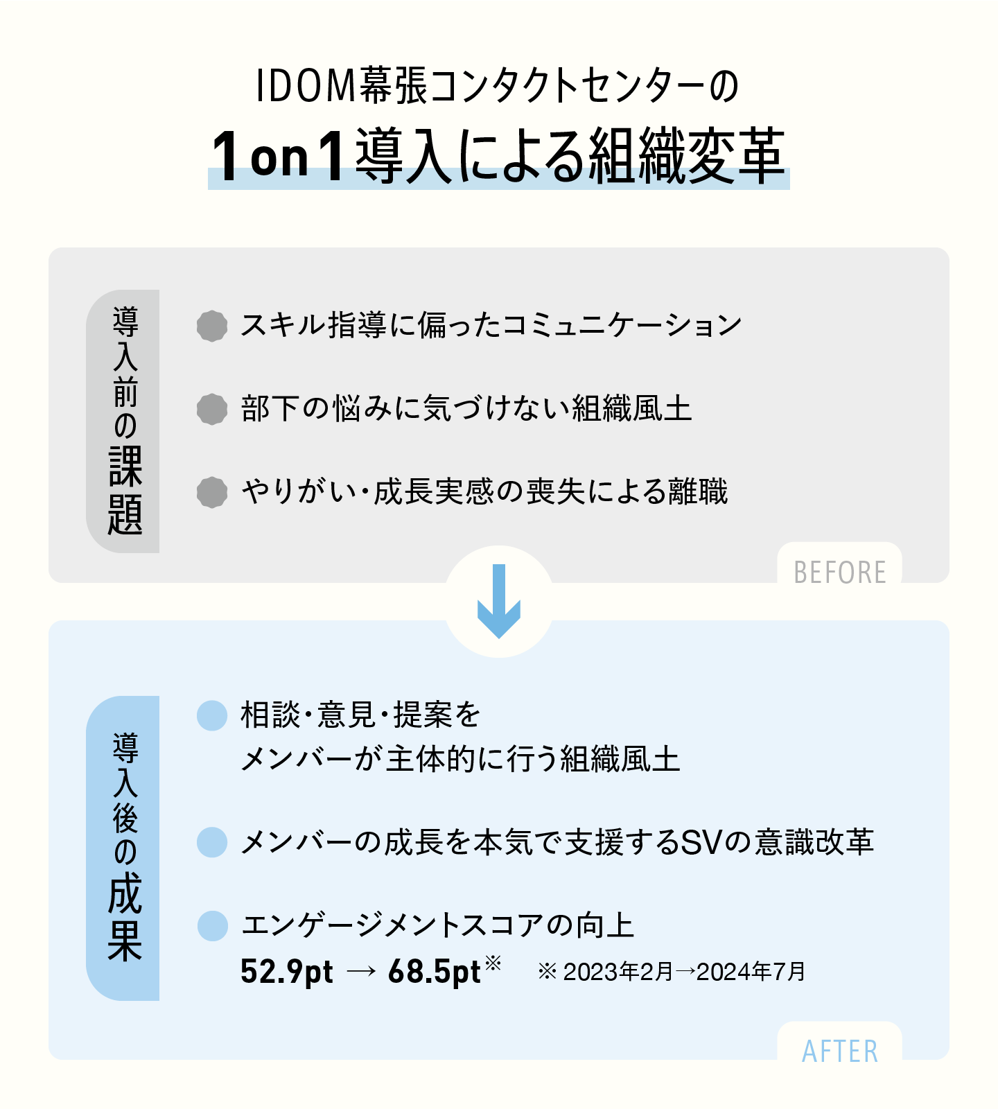 1日の電話対応数は5000本——。極限まで生産性を追求し、スタッフが持ち場を離れることが難しいコールセンターで、1on1を行う価値はあるのか。株式会社IDOMの幕張コンタクトセンターが、その問いに一つの答えを出した。