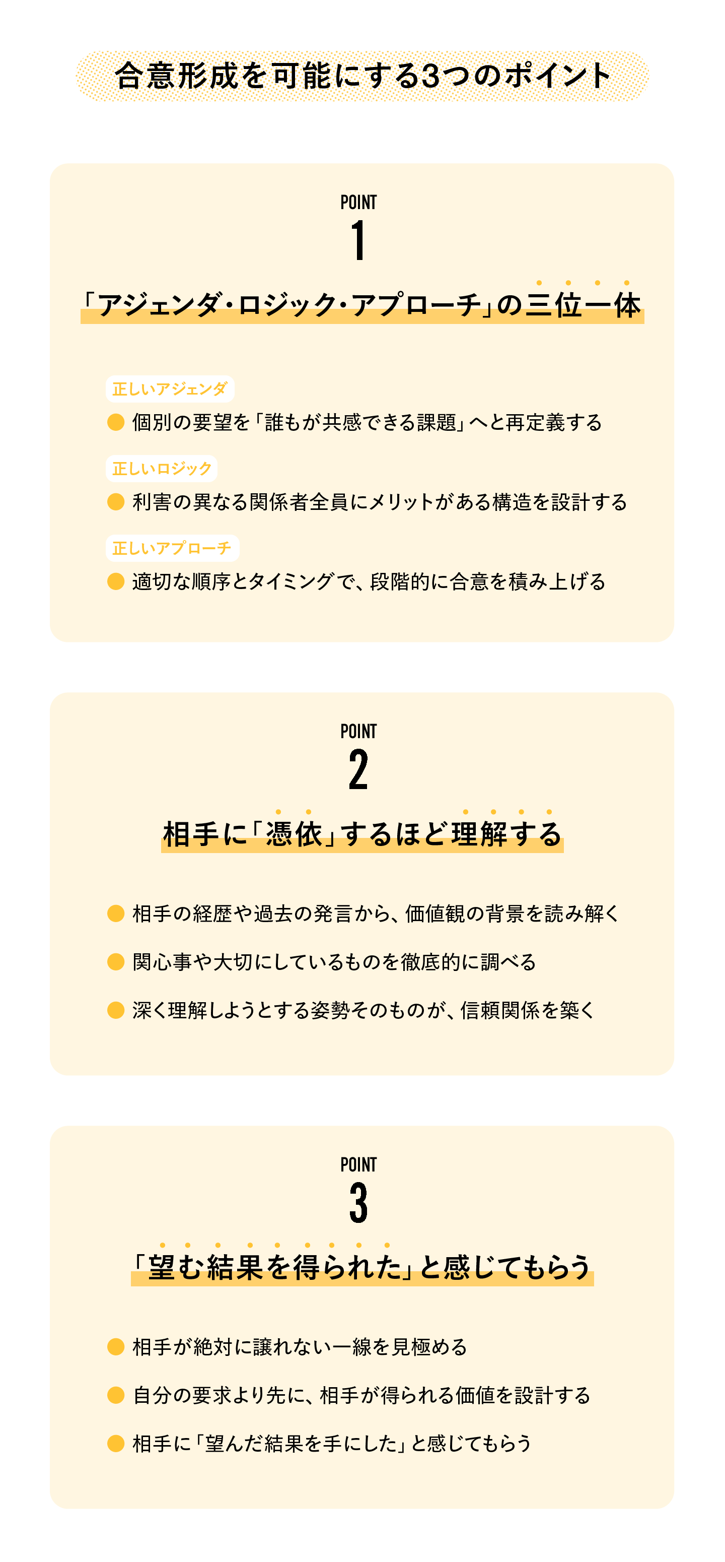 合意形成の大前提は、相手へのリスペクトです。そのリスペクトを「あなたのことを憑依するくらい考えていますよ」という態度で伝える。この信頼がなければ、交渉のテーブルにもつけないと思っています。