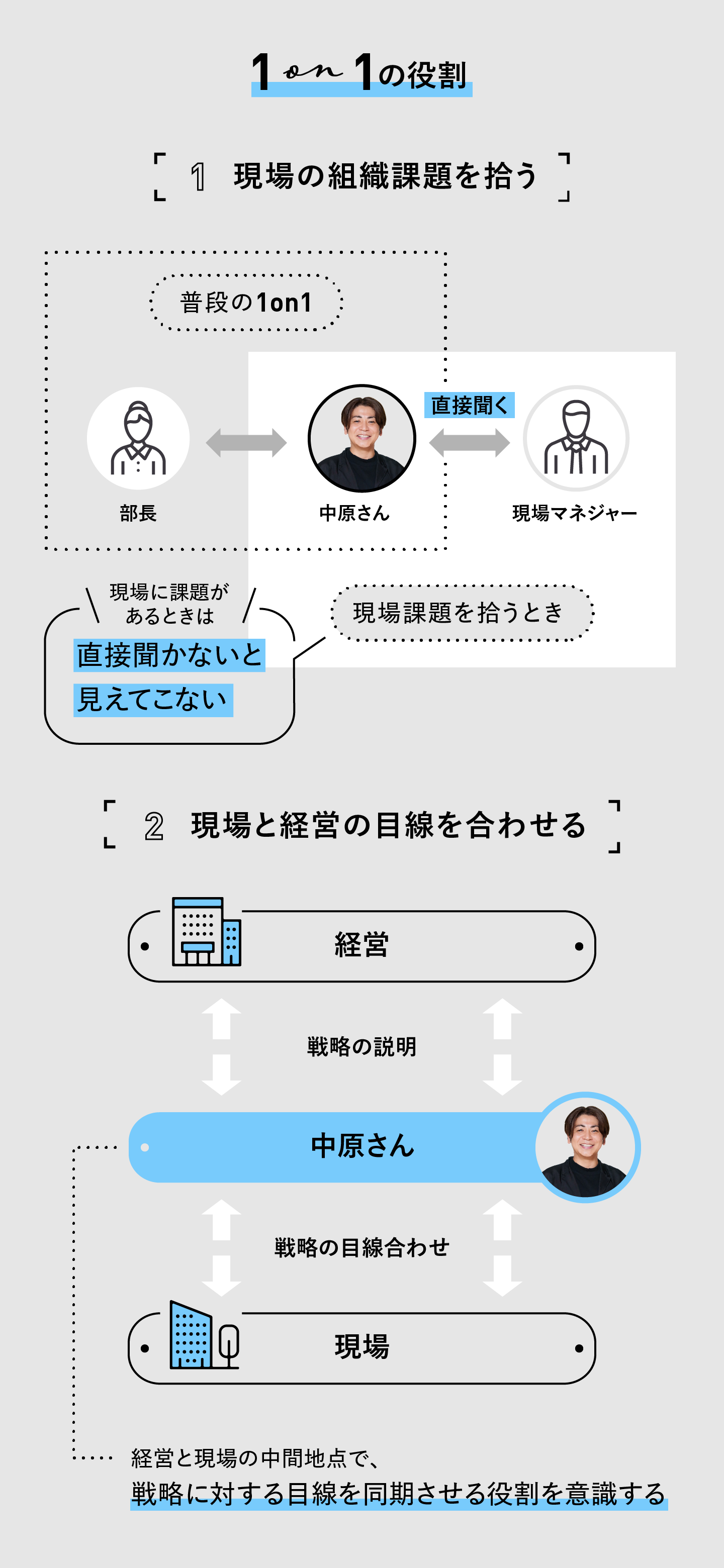 しかし、本部長になり、より経営陣に近くなったため、1on1では現場の課題を拾うことを重視するようになった。それがマネジャー、メンバーとも1on1を行う理由だ。