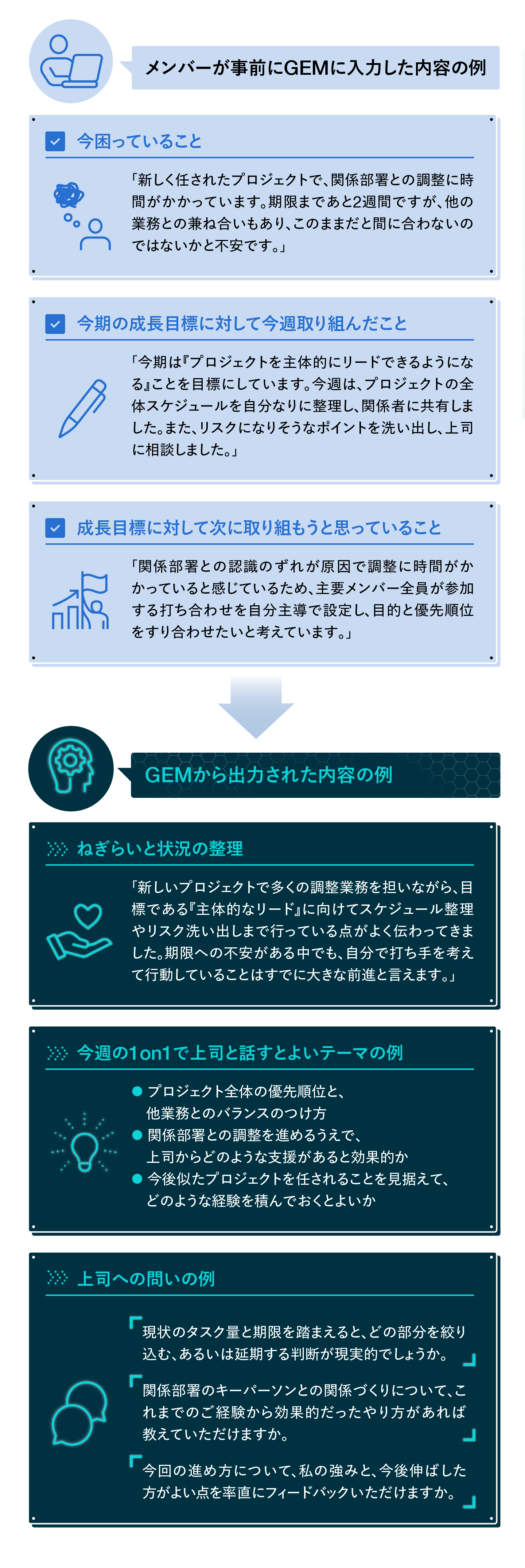 メンバーはその出力を参考にしながら、上司に投げかける内容を整理して1on1に臨みます。