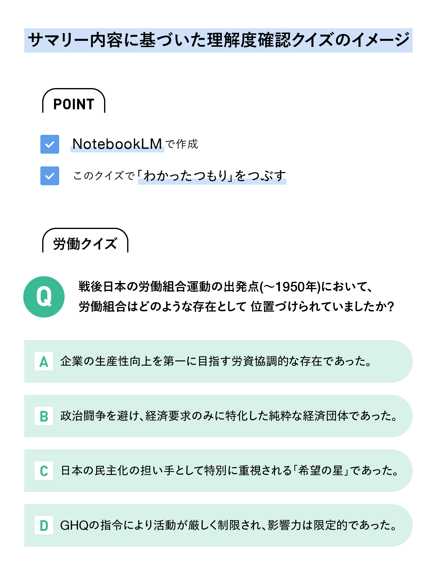引き続きNotebookLMを使って、サマリ内容に基づいた理解度確認クイズを作成します。 ここで「分かったつもり」を減らし、主体的に考えるきっかけをつくっています。なお、A社では個別のテストの点数チェックまではしていません。