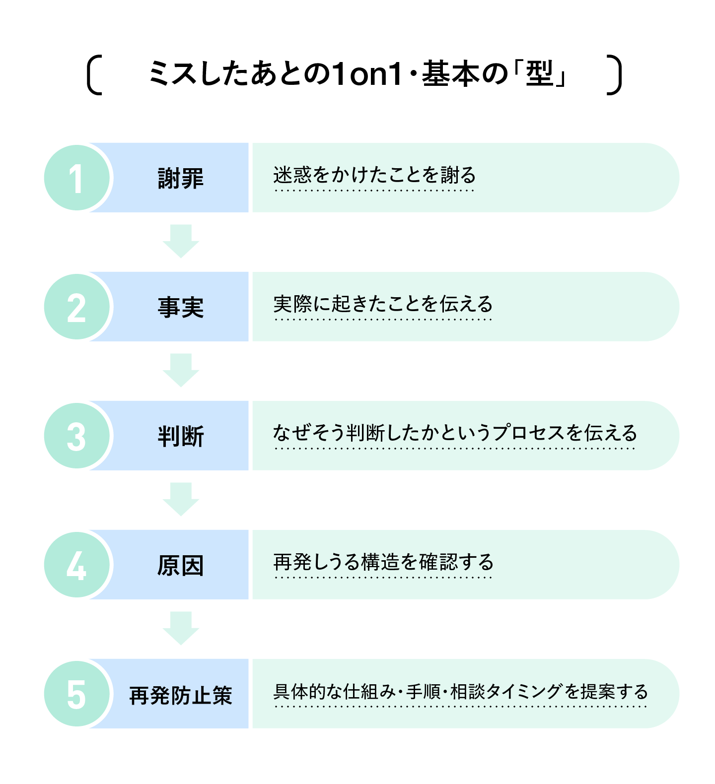 ミスをしたあとの1on1は気まずいもの。多くの人は「どう謝ればいいか」を考えがちです。しかし、上司が求めているのは、謝罪よりも再発防止に向けた整理と提案です。