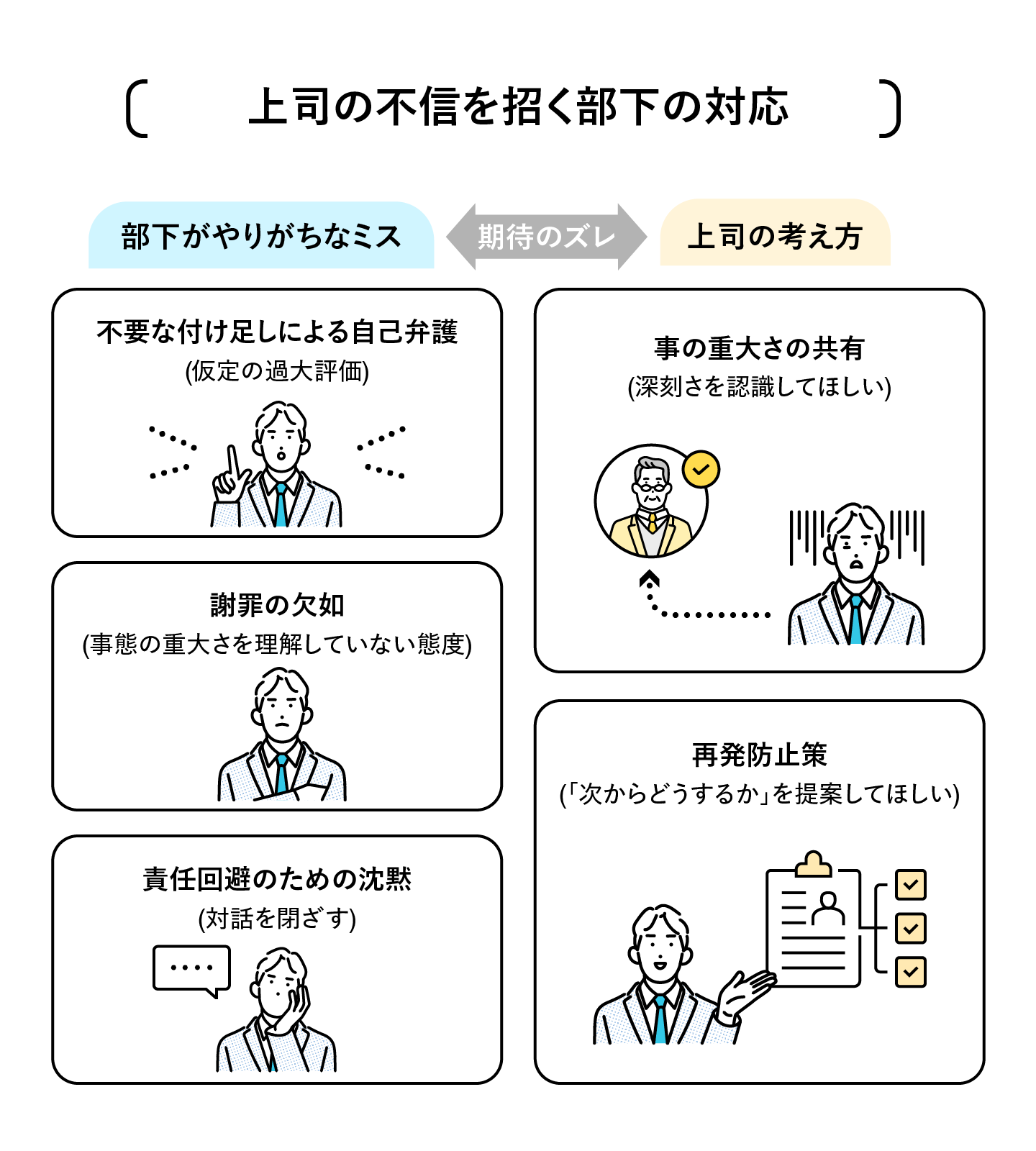 このとき、部下が「自分は仕事をしていなかったわけではない」と考え、謝罪をしないままでいると、上司は「事の重大さが伝わっていない」と受け取り、結果として関係が悪化してしまうことがあります。