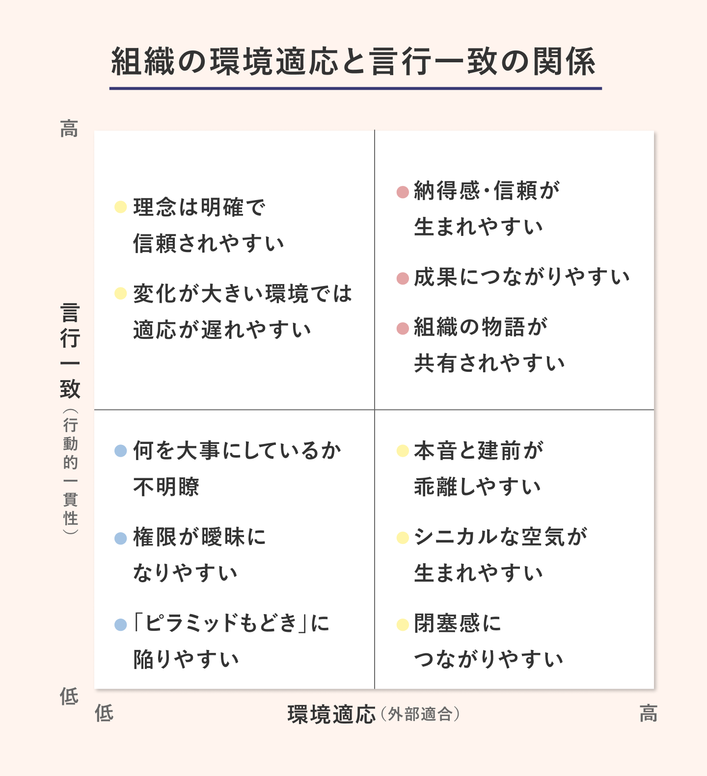 一貫性とは、対外的に語っていることが組織の中でも実践されているか。この両方がバランスよく維持されていれば、社員は幸せになりやすいし、パフォーマンスも発揮しやすい。