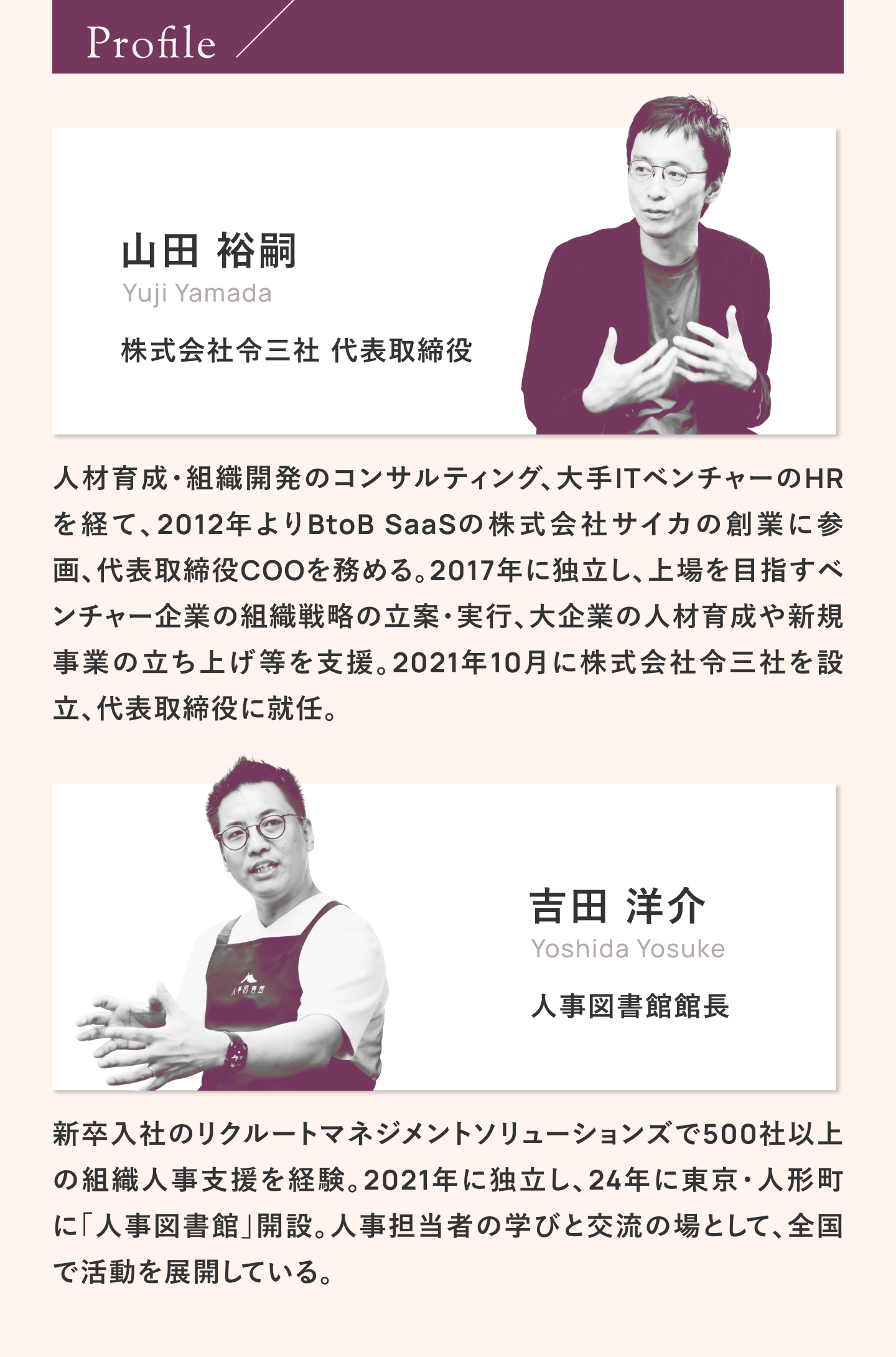 世界の先進的な組織運営を研究する令三社代表取締役・山田裕嗣氏と、人事の学び場「人事図書館」を主宰する吉田洋介氏。二人の対談の前編では、日本企業を覆う閉塞感と組織変革につまずく背景を探り、問題解消の鍵に迫った。