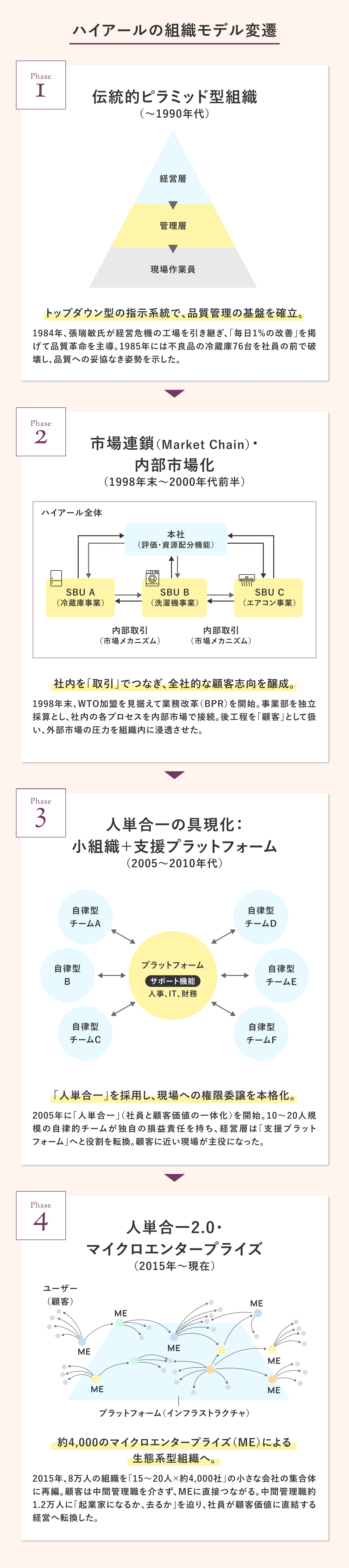 吉田 張氏は世界中の良い組織づくりのあり方を学び、その都度必要なスタイルを採り入れていますよね。ハイアールの組織形態の変遷の中で印象的だったのが、逆三角形からマイクロエンタープライズに移行するまでの間に、張氏が日本のモノづくりを参考にして組織を作ったという話です。