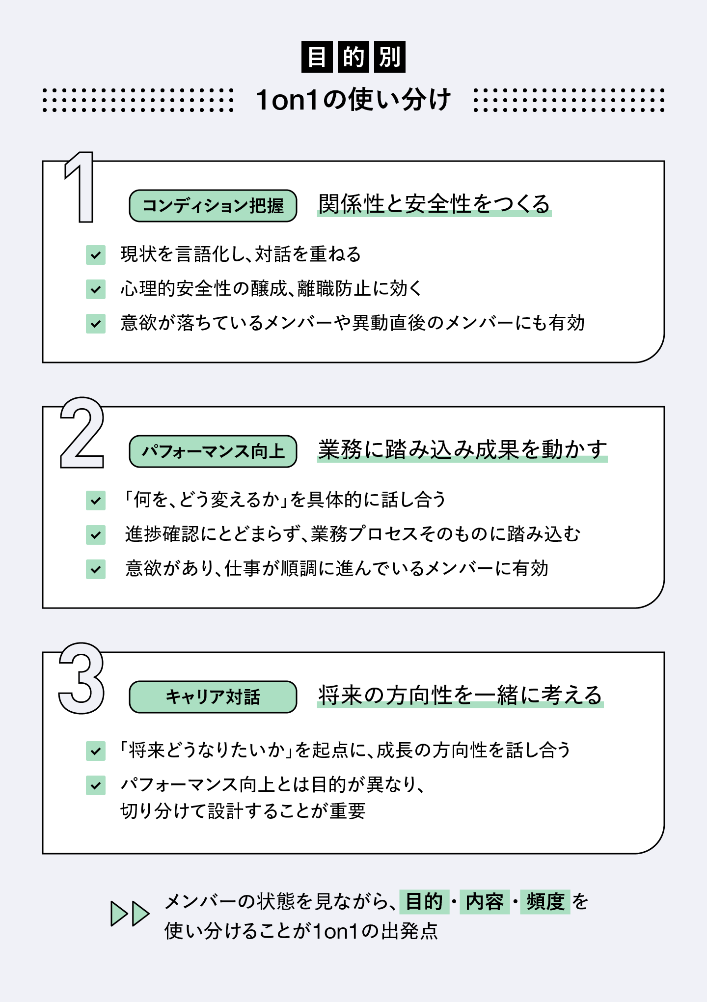 どちらが重要かという話ではありません。大切なのは、メンバーが置かれた状況に応じて目的を使い分けること。実施頻度も同様で、「全員と週1回」が正解ではありません。