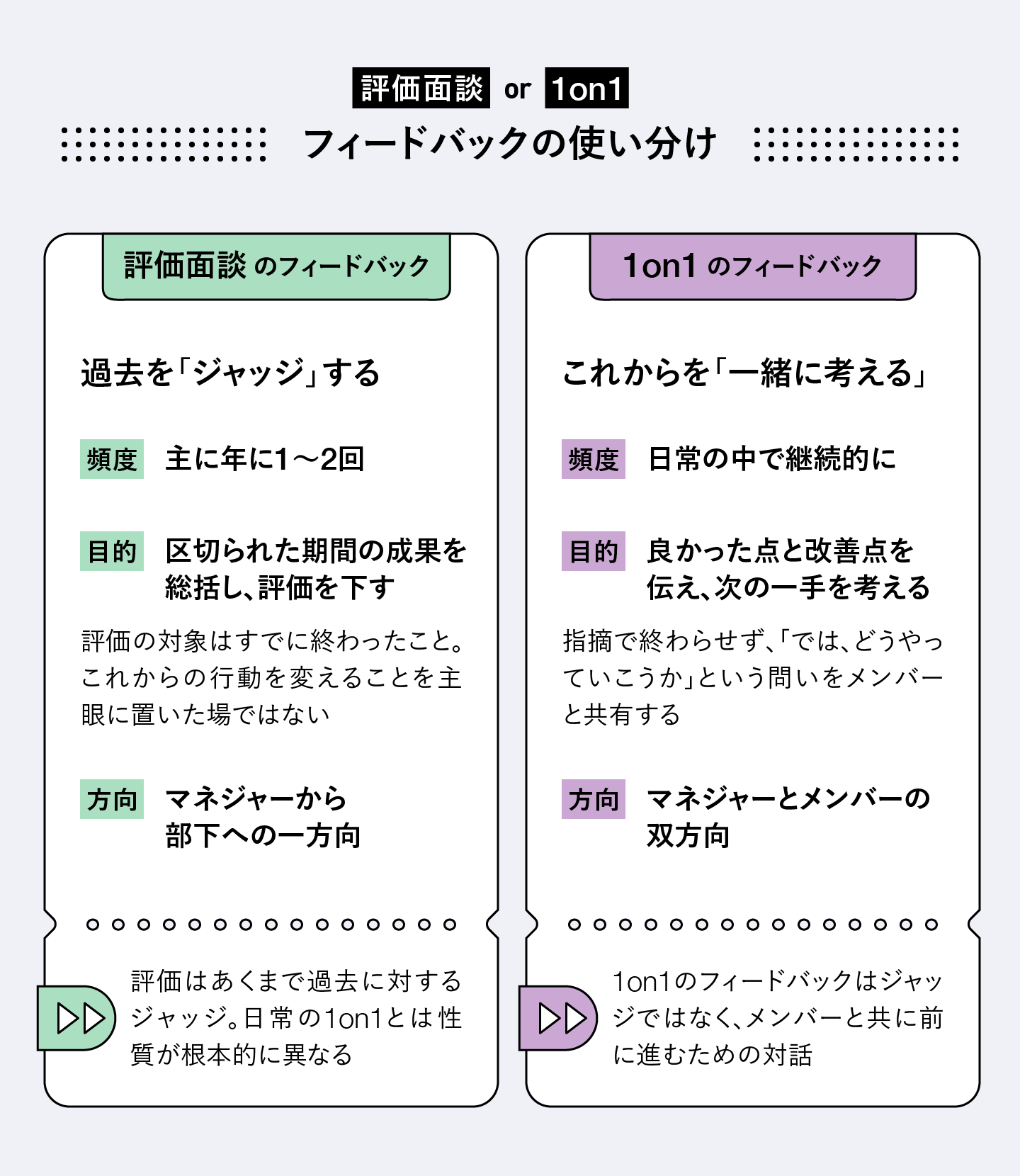 評価面談のフィードバックは、一定期間におけるメンバーのパフォーマンスを振り返り、メンバーのアウトカムに対する評価者のジャッジを伝えるものです。一方、日常的に行う1on1は、ジャッジを伝える場ではありません。