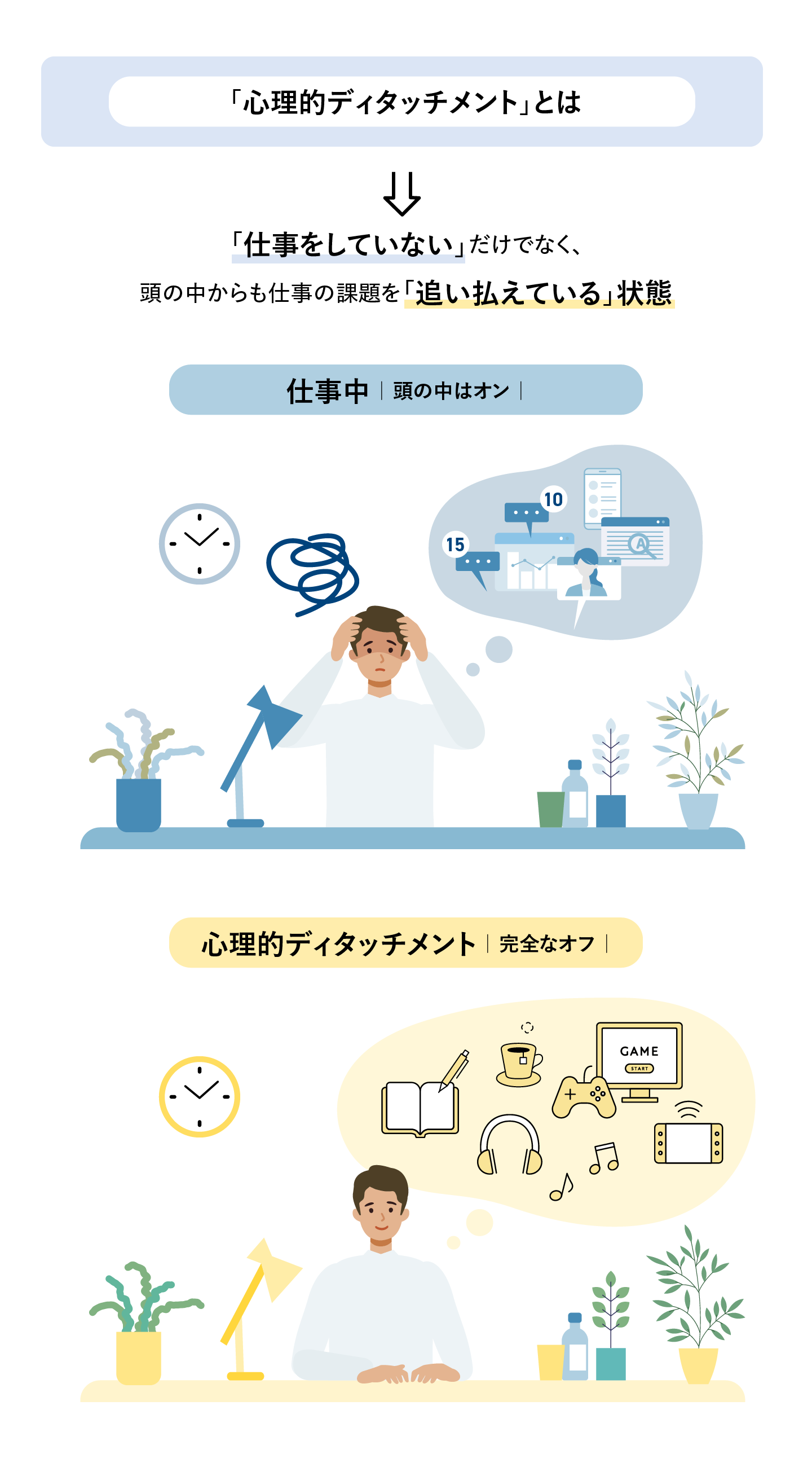 完全なオフ状態、つまり、仕事をしていないだけでなく、頭の中からも仕事関連の課題や悩みを追い払えている状態のことを、学術的な用語で「心理的ディタッチメント」と言います。