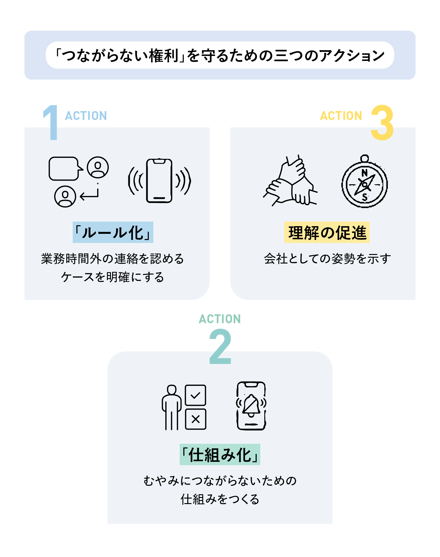 組織として、「つながらない権利」の保障のためにどんなことができるのか、ここでは三つの具体策を示します。