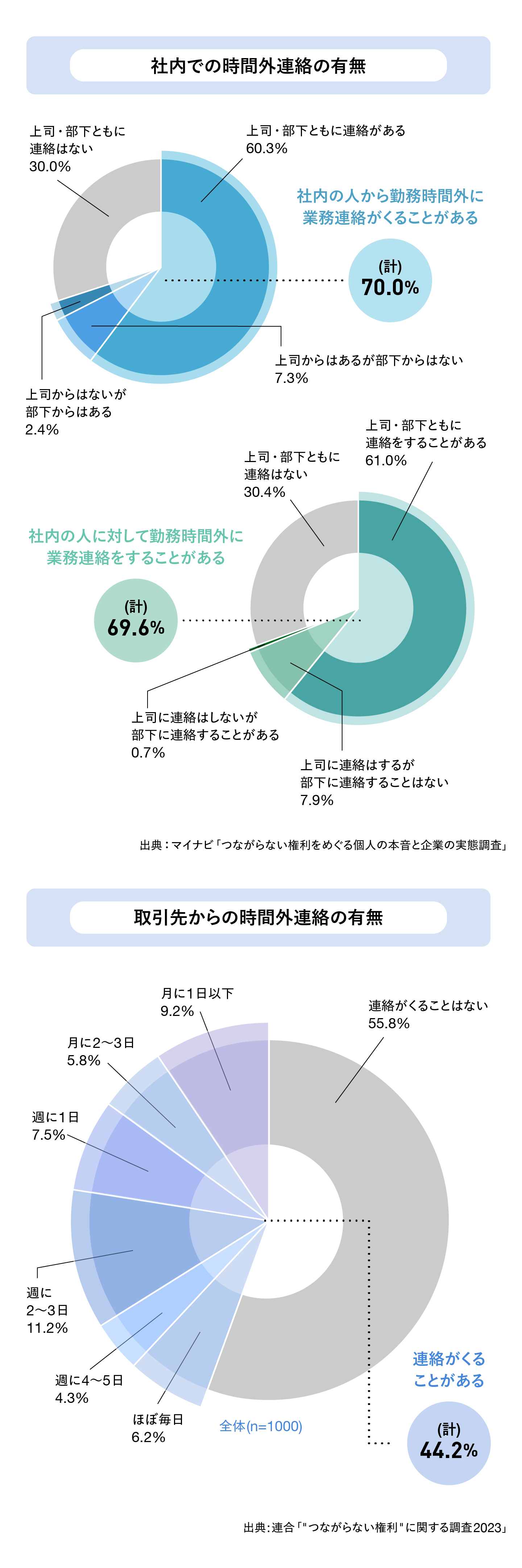2025年12月にマイナビが行った調査によると、上司・部下のいる正社員の70.0%が「社内の人から勤務時間外に業務連絡がくることがある」と回答しています。また、「社内の人に勤務時間外に連絡をすることがある」も69.6%に達しています。