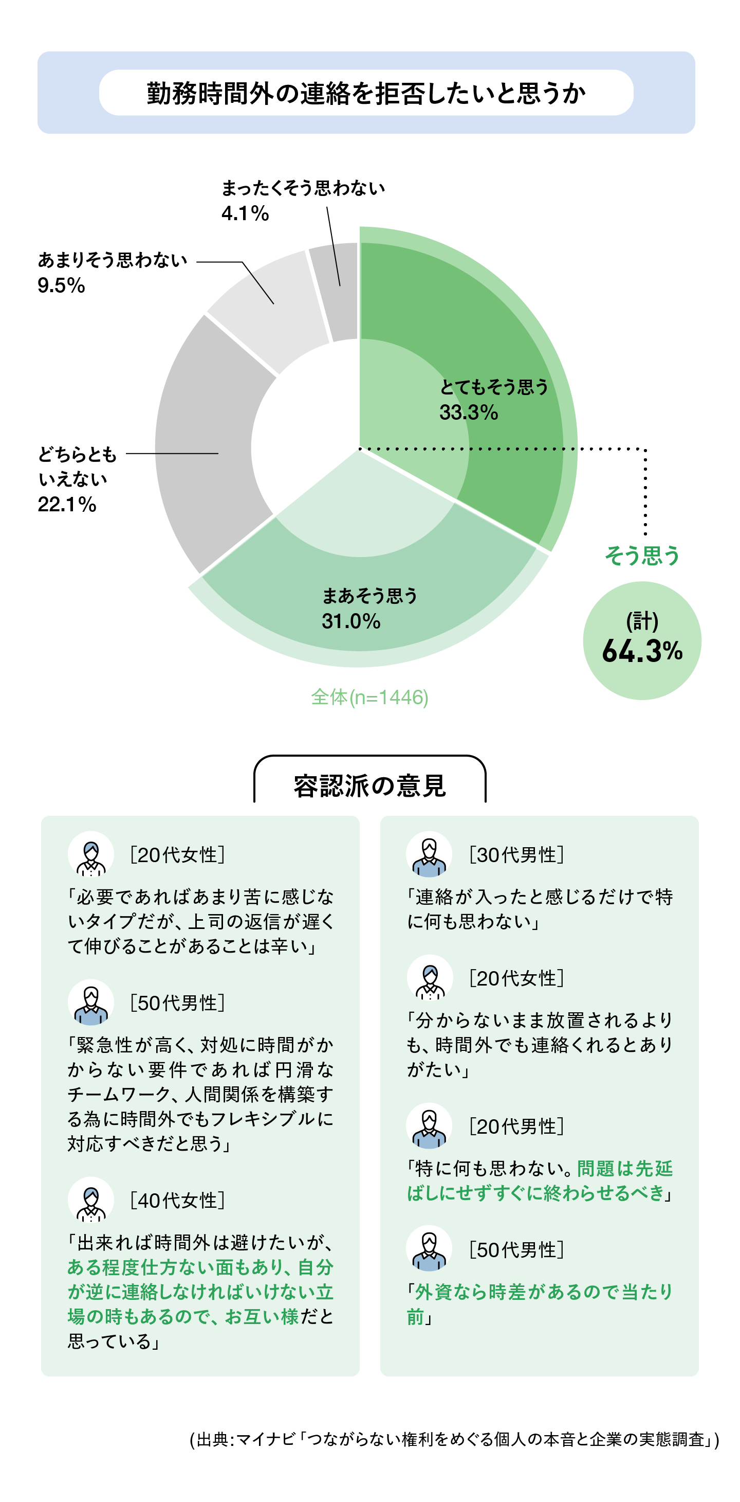 先のマイナビの調査では、正社員の64.3%が「勤務時間外の業務連絡を拒否したい」と回答していますが、「問題は先延ばしにせずすぐに終わらせるべき」、「ある程度仕方ない」と許容する声もあります。